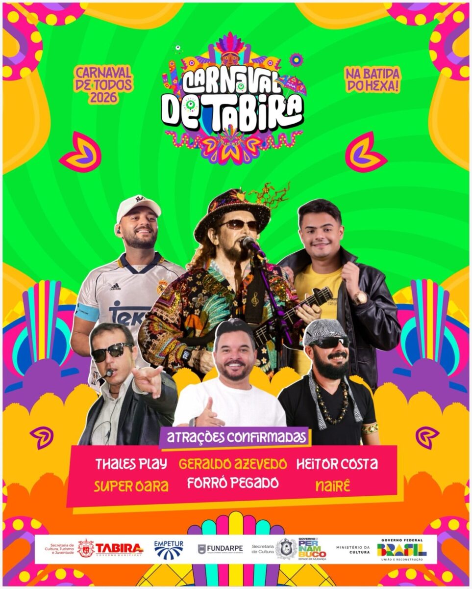 A Prefeitura de Tabira, por meio da Secretaria de Cultura, Turismo e Juventude, iniciou a divulgação das atrações que irão compor a programação do Carnaval 2026, que este ano traz o tema “Carnaval de Todos – Na Batida do Hexa!”. A festa acontecerá entre os dias 13 e 17 de fevereiro, na tradicional Praça Pedro Pires Ferreira, prometendo movimentar a cidade com muita música, alegria e valorização cultural. O anúncio das atrações está sendo realizado através das redes sociais oficiais