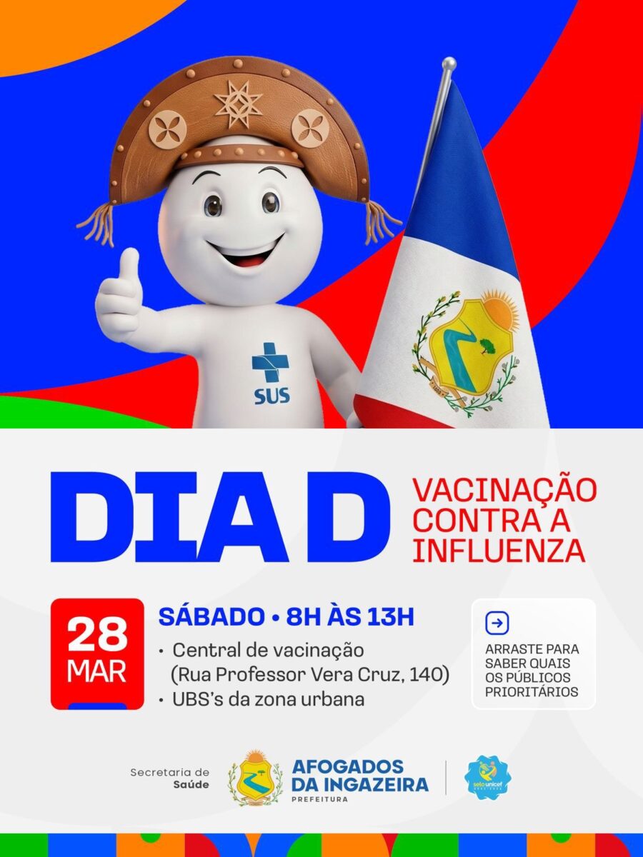A Prefeitura de Afogados da Ingazeira realiza, neste sábado (28), o Dia D de vacinação contra a influenza, com o objetivo de ampliar a cobertura vacinal e proteger a população contra as complicações causadas pelo vírus. A mobilização acontece das 8h às 13h, na Central de Vacinação, localizada na Rua Professor Vera Cruz, nº 140, além de todas as Unidades Básicas de Saúde da área urbana do município. Já na zona rural, a imunização será realizada ao longo da semana,