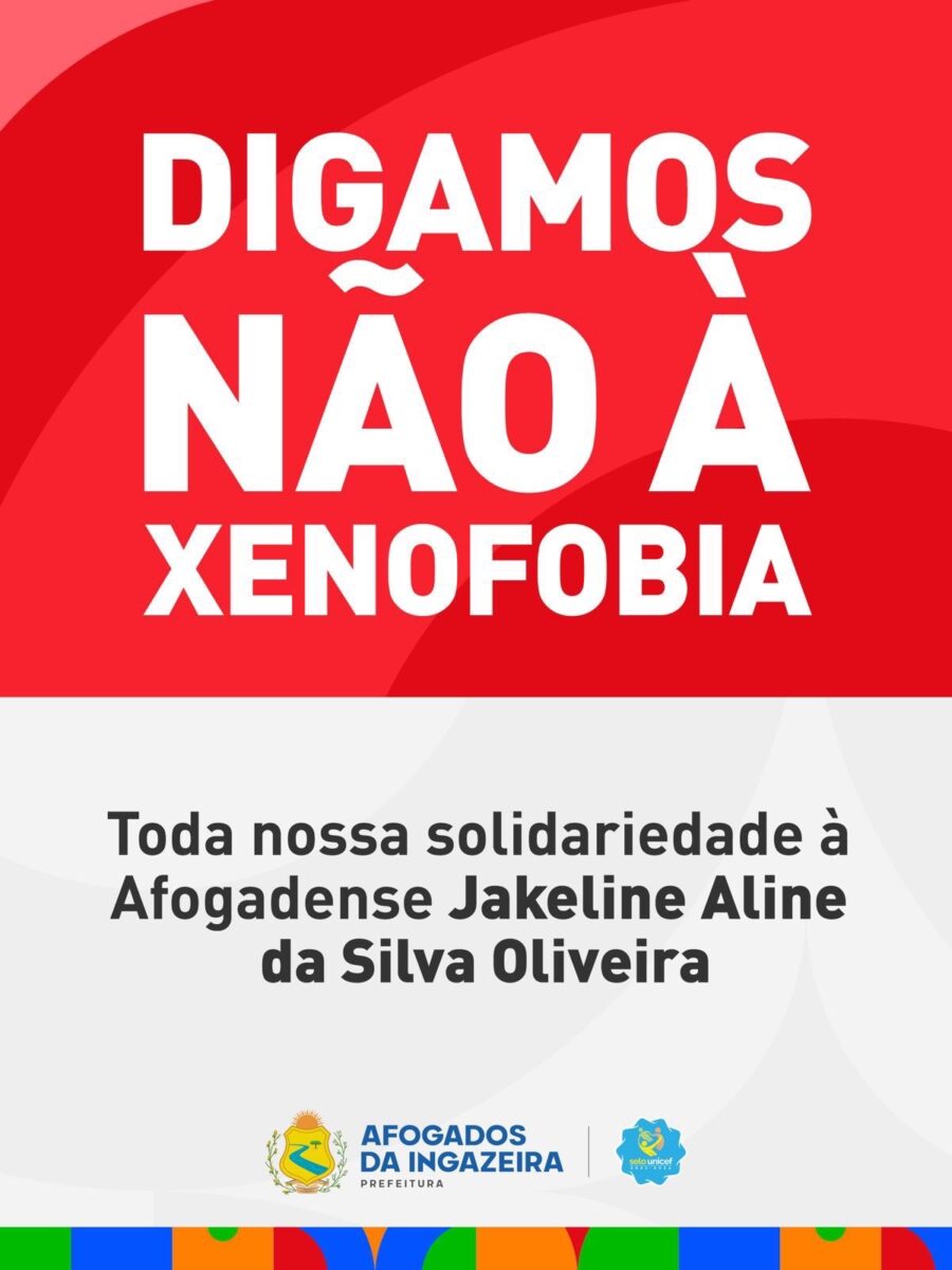 CONFIRA A NOTA A xenofobia é uma prática inaceitável em uma sociedade minimamente civilizada, além de ser crime passível de punição. Informamos que o Prefeito Sandrinho Palmeira entrou em contato com Jakeline, por telefone, colocando-se inteiramente à disposição para ajudá-la no que for necessário. Por um mundo melhor e mais justo, lutemos todos contra a xenofobia e todas as outras formas de intolerância.
