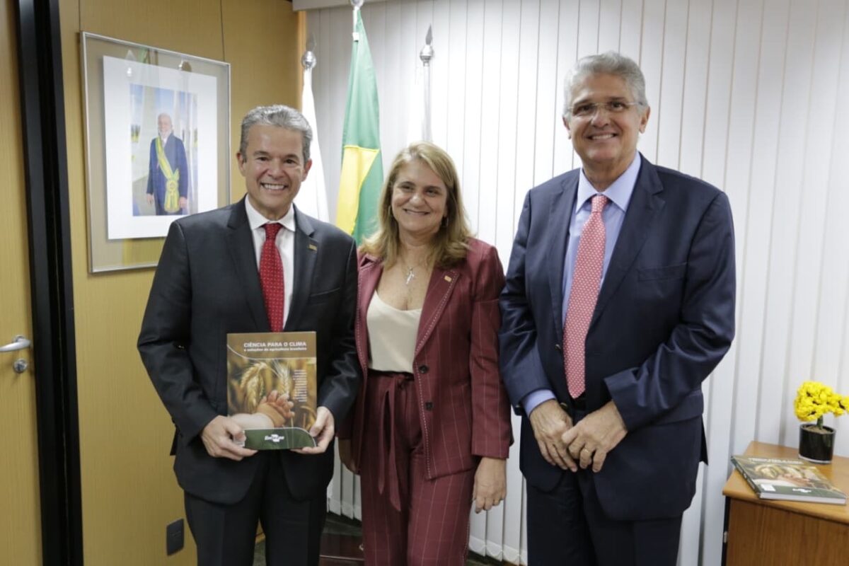 Guilherme Coelho aceitou o convite do ministro da Agricultura e Pecuária, André de Paula, para ocupar o cargo de presidente do Conselho de Administração da Embrapa (Consad). Nesta quarta-feira (9), acompanhado do ministro, Coelho visitou a presidente da Embrapa, Silvia Massruhá, e toda a sua diretoria na sede da instituição em Brasília-DF. O Consad é o órgão da administração superior da empresa, responsável pela orientação estratégica, organização, controle e avaliação de suas atividades. “Recebo com grande alegria e honra o