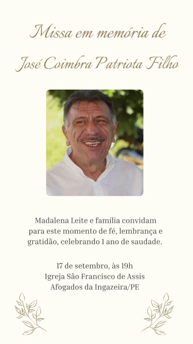 Madalena Leite Patriota, viúva de José Patriota, juntamente com toda a família, convida a população para este momento especial de fé, memória e gratidão pela vida e legado deixado pelo político.