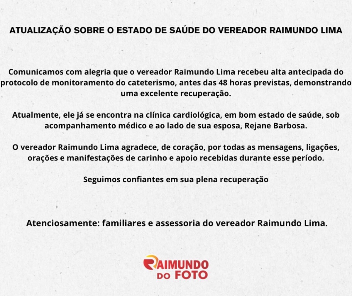 Em nota divulgada pela assessoria, o vereador Raimundo Lima manifestou gratidão pelas inúmeras demonstrações de carinho recebidas durante este período. Mensagens de apoio, ligações telefônicas e orações vindas de colegas, amigos e da população em geral têm servido como fonte de força e motivação para o político.