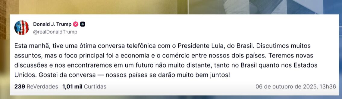 Trump confirmou que haverá novos encontros entre os líderes e sinalizou uma reunião presencial “em um futuro não tão distante”, tanto no Brasil quanto nos Estados Unidos. O presidente americano encerrou sua mensagem afirmando que apreciou a conversa e que os dois países terão boas relações.