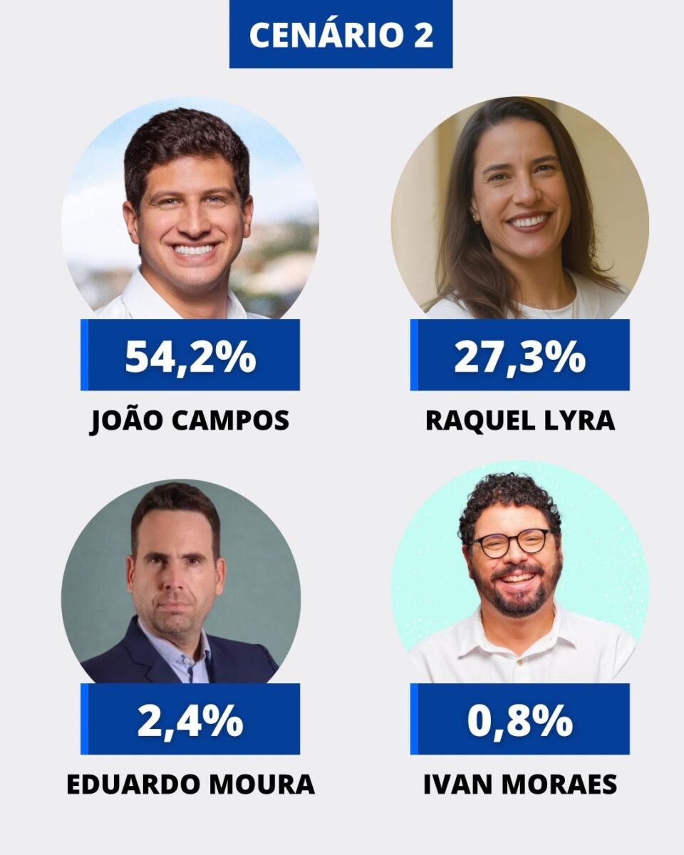 No segundo cenário, trocando Gilson Machado por Eduardo Moura (Novo), João desponta com 54,2%, e Raquel com 27,3%, enquanto o vereador recifense pontua 2,4% e Ivan Moraes, 0,8%. Brancos e nulos somam 8,3%, e indecisos, 7%.