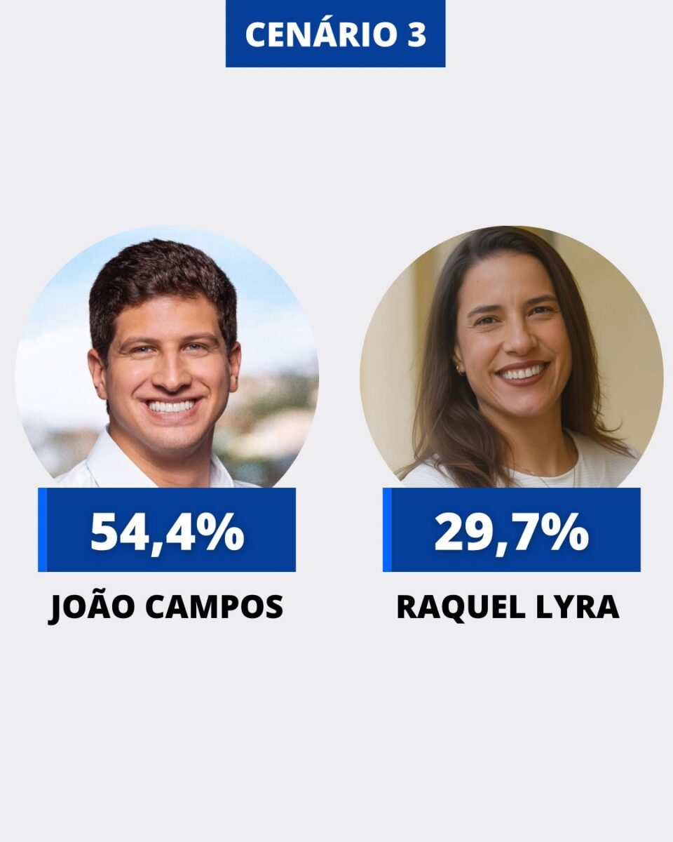 No terceiro e último cenário, confrontados apenas João e Raquel, o socialista lidera com 54,4% e a governadora aparece com 29,7%. Brancos e nulos somam 8,7%, e indecisos, 7,2%.