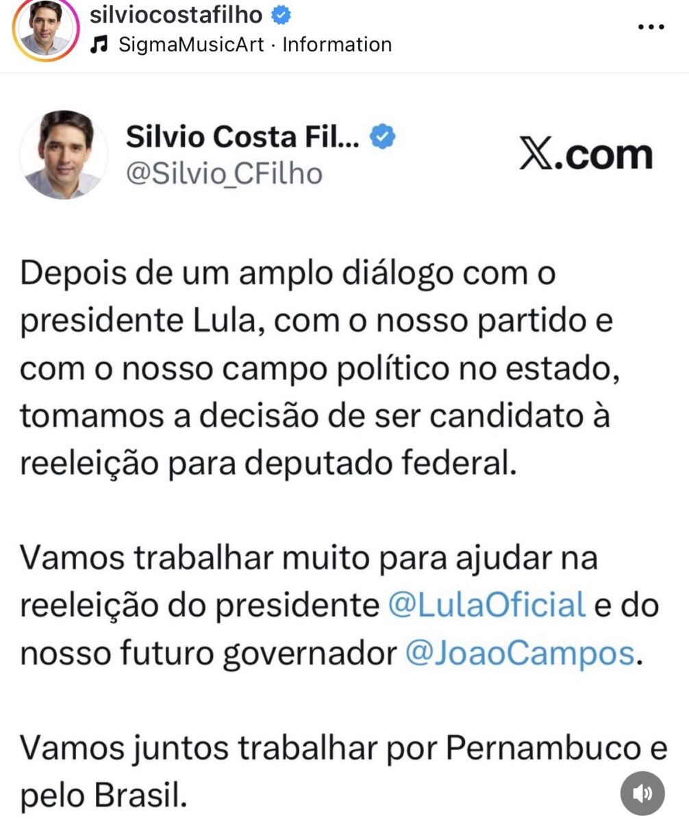 Na publicação, Silvio Costa Filho destacou que pretende intensificar sua atuação política com foco no fortalecimento de alianças no estado. Ele também reafirmou seu compromisso com o projeto nacional liderado por Lula, defendendo a continuidade da atual gestão.