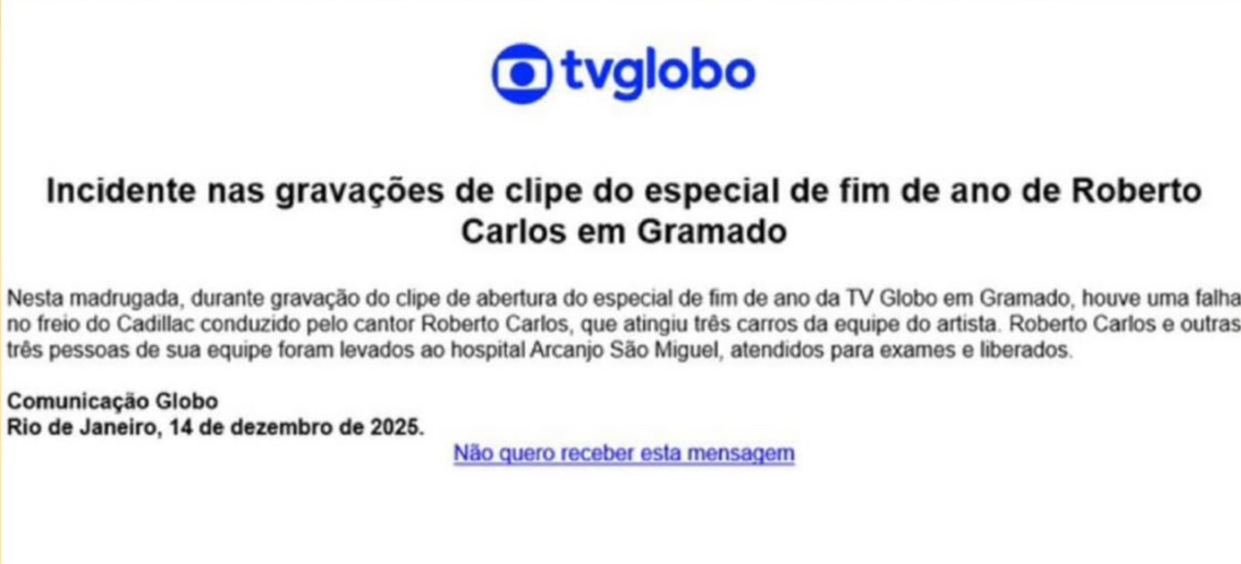 “Nesta madrugada, durante gravação do clipe de abertura do especial de fim de ano da TV Globo em Gramado, houve uma falha no freio do Cadillac conduzido pelo cantor Roberto Carlos, que atingiu três carros da equipe do artista”, informou a emissora.