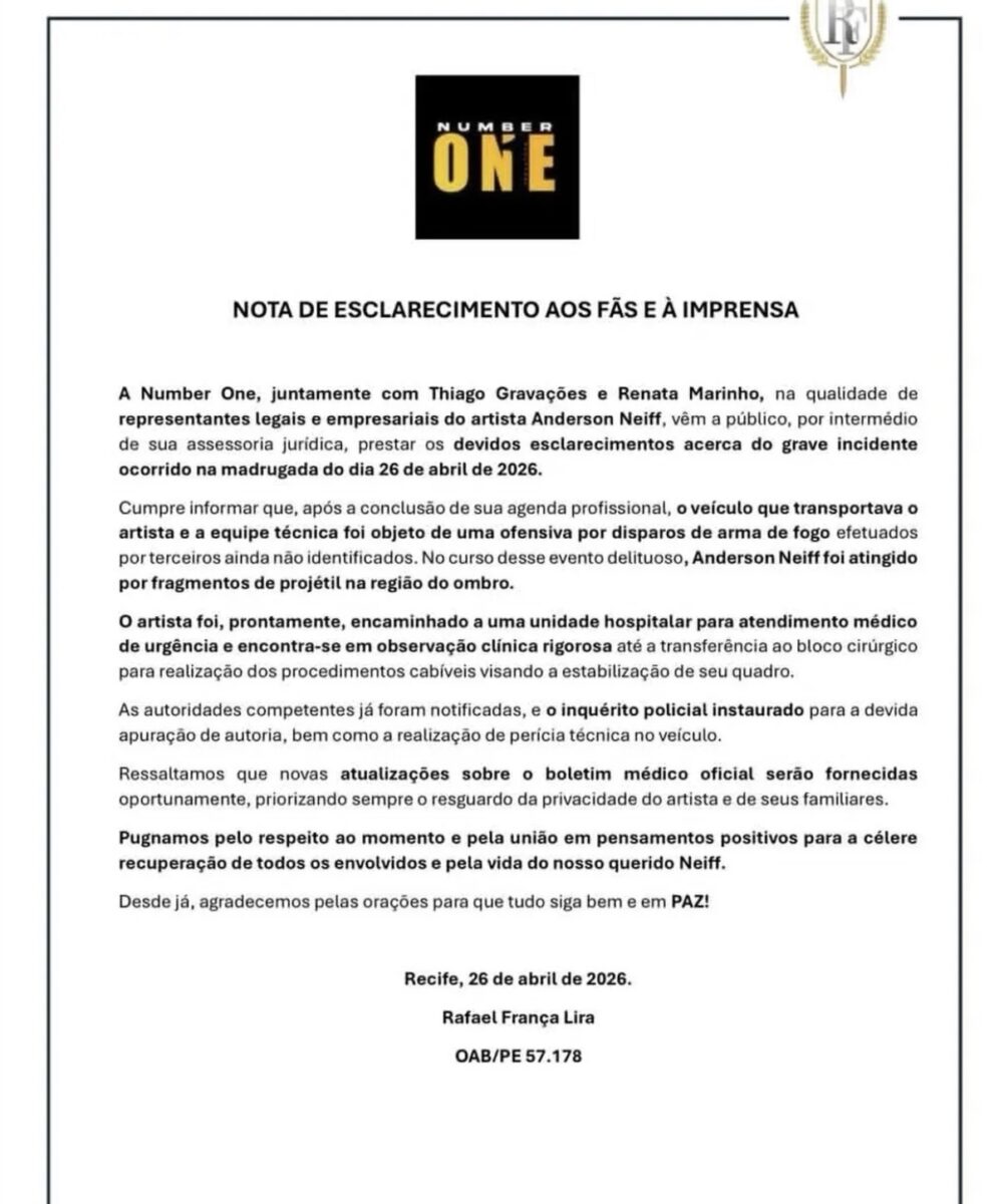 A informação foi confirmada pelo produtor do cantor. De acordo com ele, Neiff foi o único ferido durante o ataque. Em nota oficial, a equipe do artista, representada por Thiago Gravações, responsável pela agenda de compromissos, afirmou que os demais integrantes estão bem e fora de perigo.