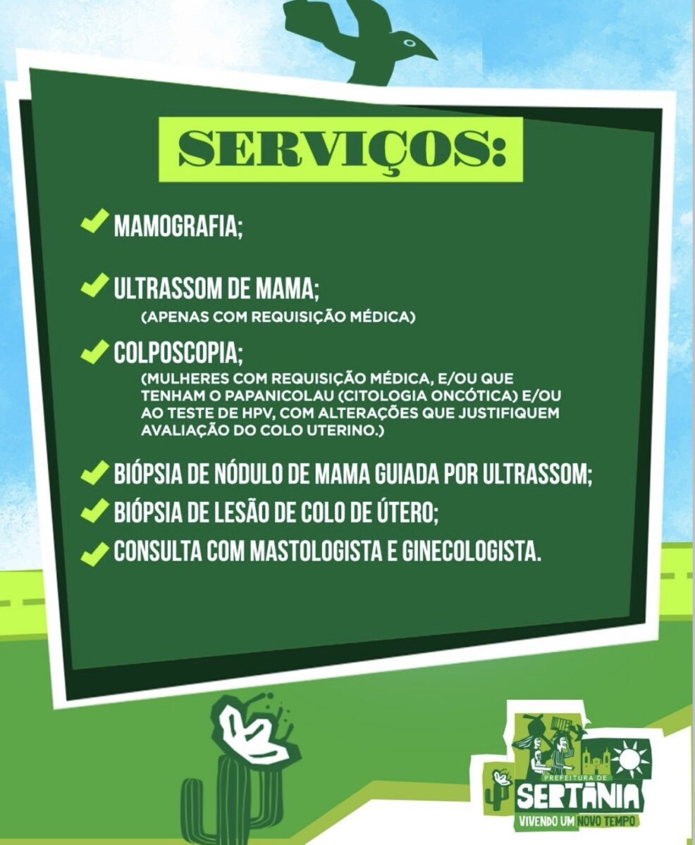 Durante os três dias, serão ofertados diversos atendimentos e exames, com o objetivo de ampliar o acesso das mulheres do município a serviços de prevenção e diagnóstico. Entre os procedimentos disponíveis estão mamografia, ultrassom de mama — realizado mediante requisição médica — e colposcopia, destinada a mulheres que possuam encaminhamento médico ou que apresentem alterações identificadas no exame de Papanicolau (citologia oncótica) ou no teste de HPV.