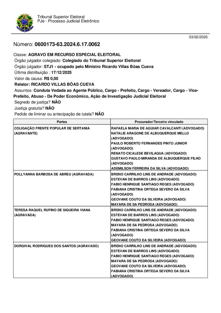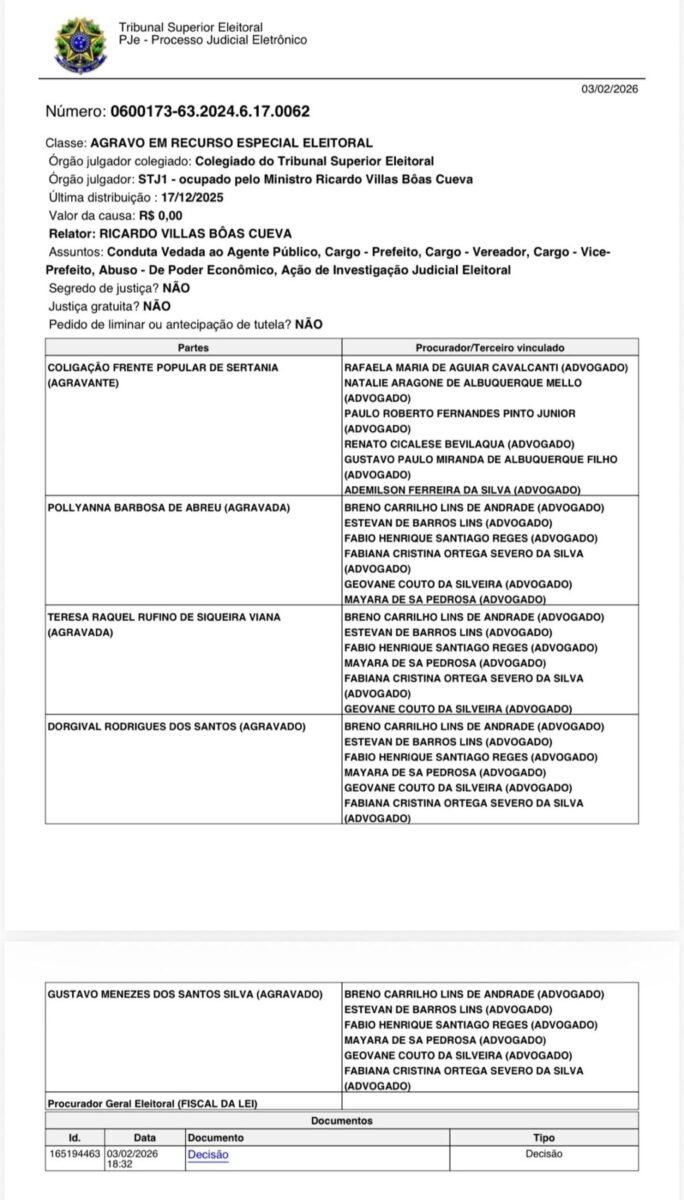 O Tribunal Superior Eleitoral (TSE) rejeitou, nesta segunda-feira (3), recurso que buscava cassar o mandato da prefeita de Sertânia, Pollyanna Barbosa de Abreu, e de sua vice, Teresa Raquel Rufino de Siqueira Viana. A decisão, assinada pelo ministro Ricardo Villas Bôas Cueva, mantém a gestão municipal eleita em 2024.