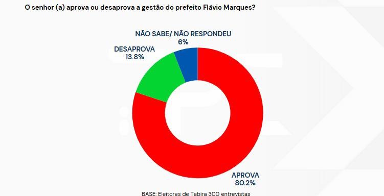 De acordo com o levantamento, 80,2% dos entrevistados afirmaram aprovar a administração municipal. Apenas 13,8% disseram desaprovar, enquanto 6% não souberam ou preferiram não responder.