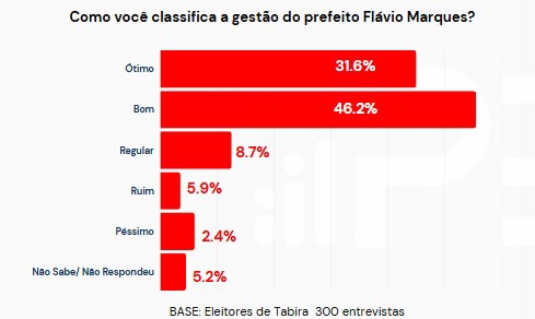 Uma nova pesquisa de opinião pública realizada pelo Instituto Expressão revelou que a gestão do prefeito Flávio Marques conta com expressiva aprovação da população tabirense.