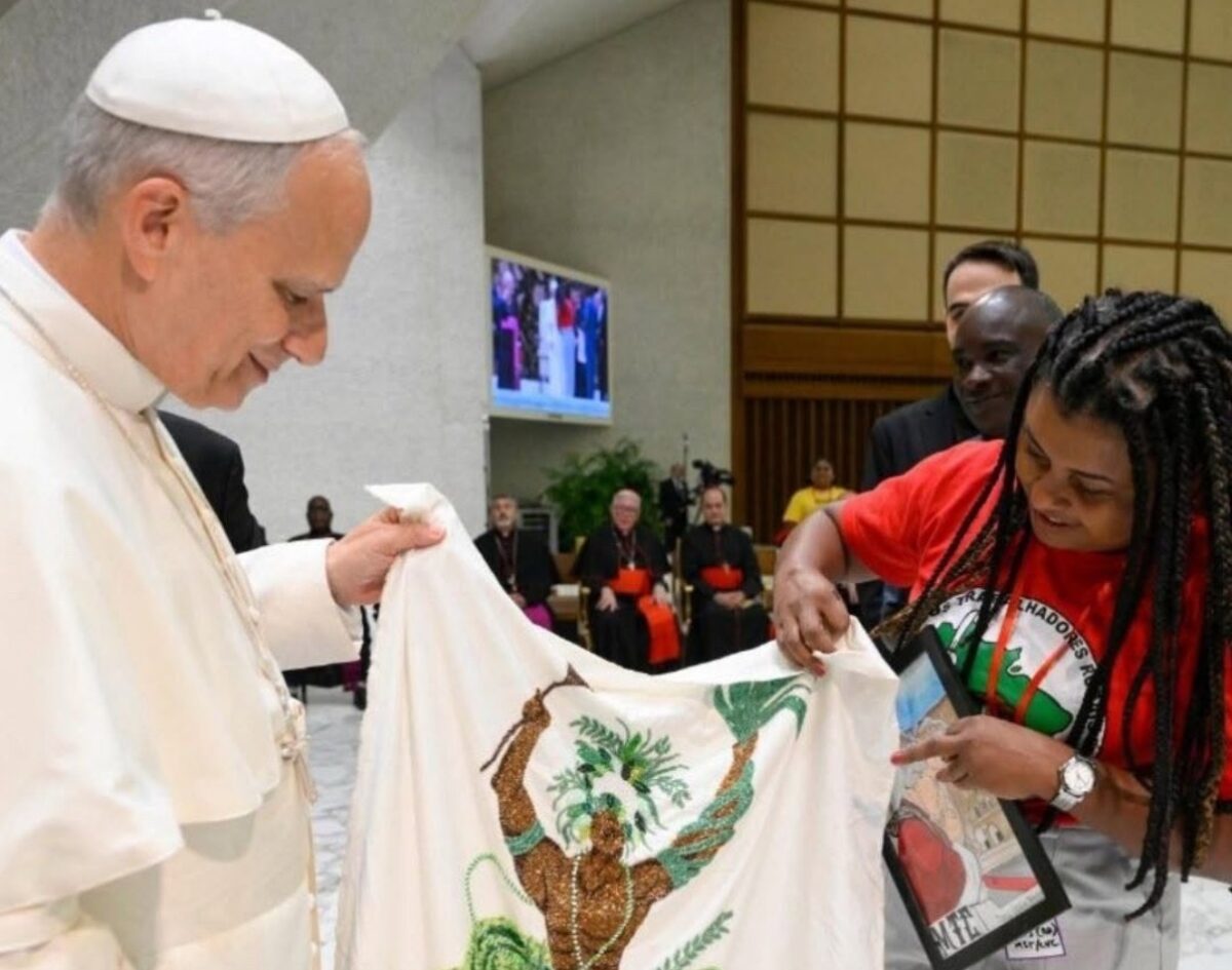 Durante a audiência, a representante do MST, Ayala Ferreira, presenteou o papa com uma bandeira com imagem do orixá Ossanha, também chamado de Ossain, associado à medicina natural nas religiões afro-brasileiras.